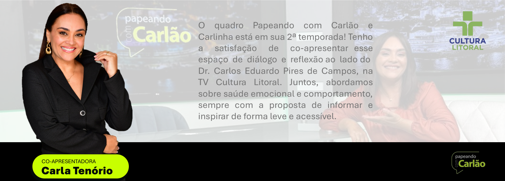 No Papeando com Carlão desta terça (01), o apresentador Carlos Eduardo recebe novamente a psicóloga e co-apresentadora do quadro ‘Carlão com Carlinha’, Carla Tenório, para um bate-papo que une fé, ciência e saúde mental.